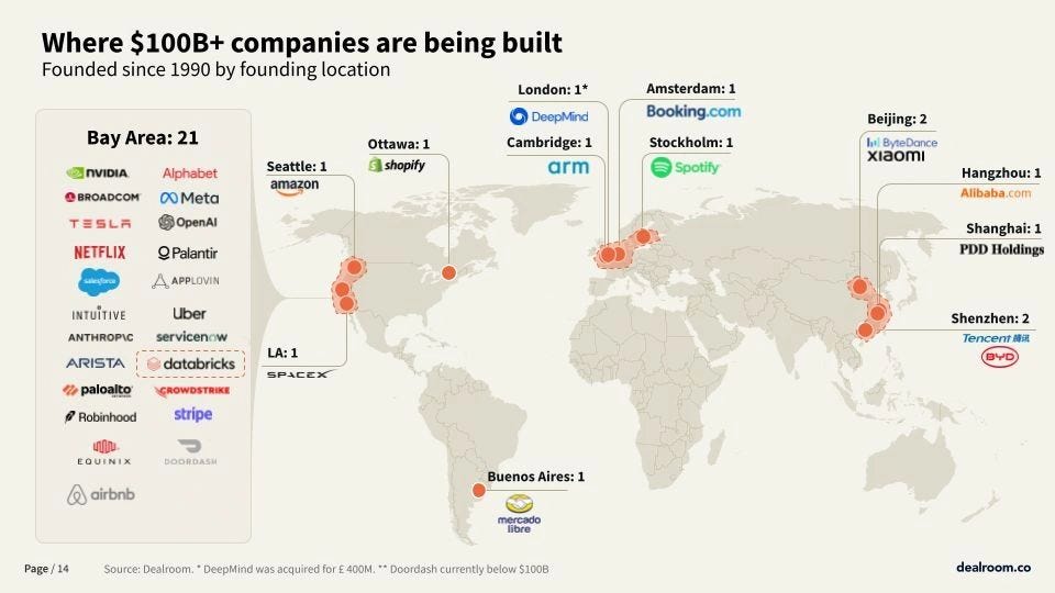 Execution continues to globalize, of course. Talent, manufacturing, and deployment disperse across borders and regions. But category creation, these $100B companies, becomes more centralized, not less, as it concentrates in the handful of systems that can still hold uncertainty open long enough for compounding to occur.