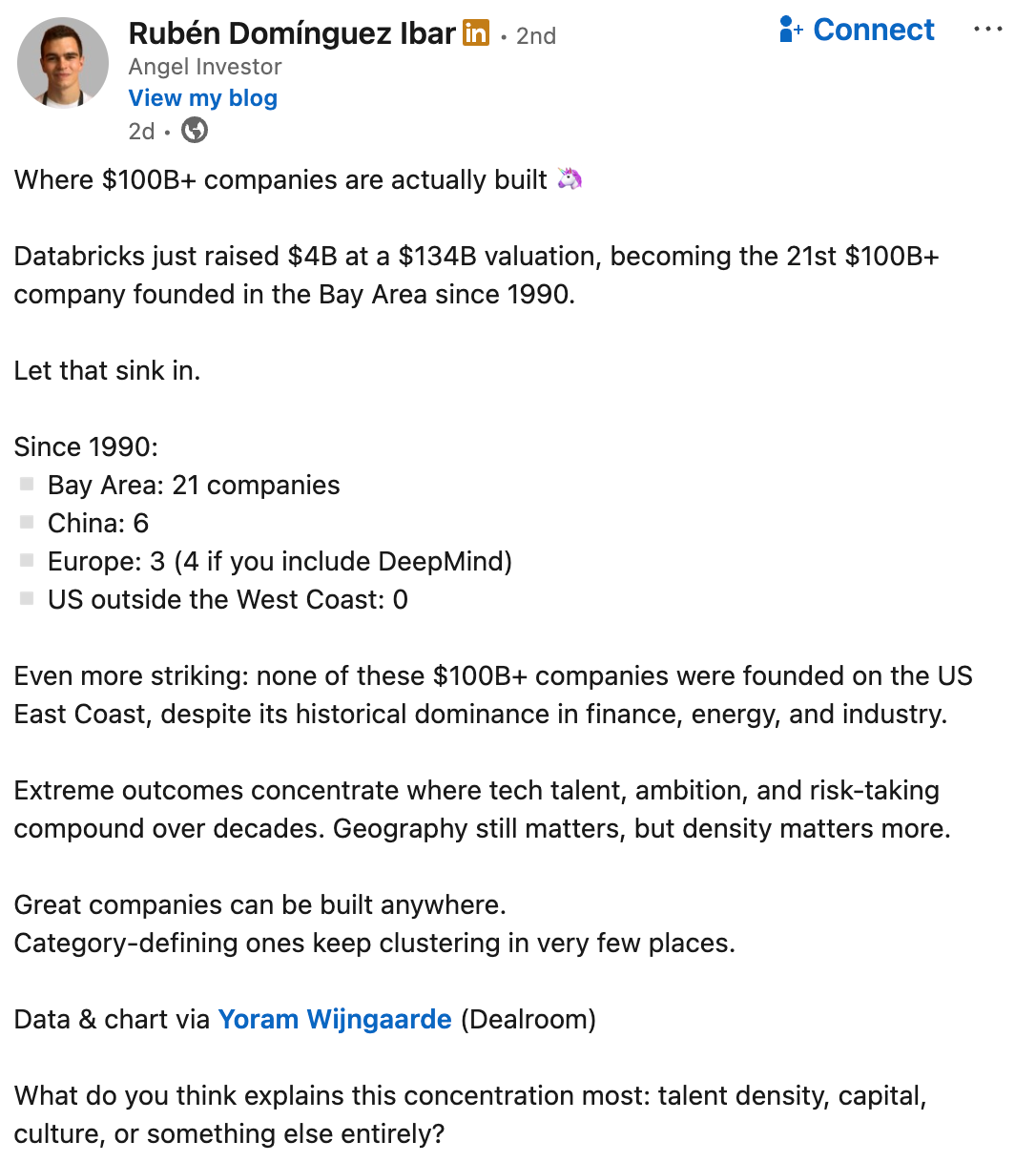 My pal Freddie just sent me an interesting LinkedIn post from Rubén, an angel investor, which outlined the following: