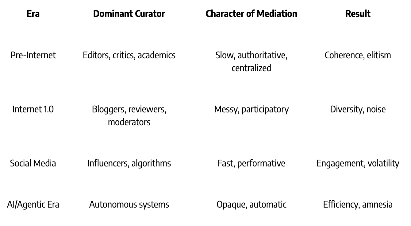 Think briefly back to before algorithms, feeds, and “content,” when culture depended on a priesthood of interpreters: editors, critics, DJs, museum curators, professors. God knows they were not always right, but they performed a vital economic function: filtering abundance into something more coherent. In other words, gatekeeping the enormous amounts of shit that’s created. These interpreters were the market’s price stabilizers, so to speak, for truth and taste.