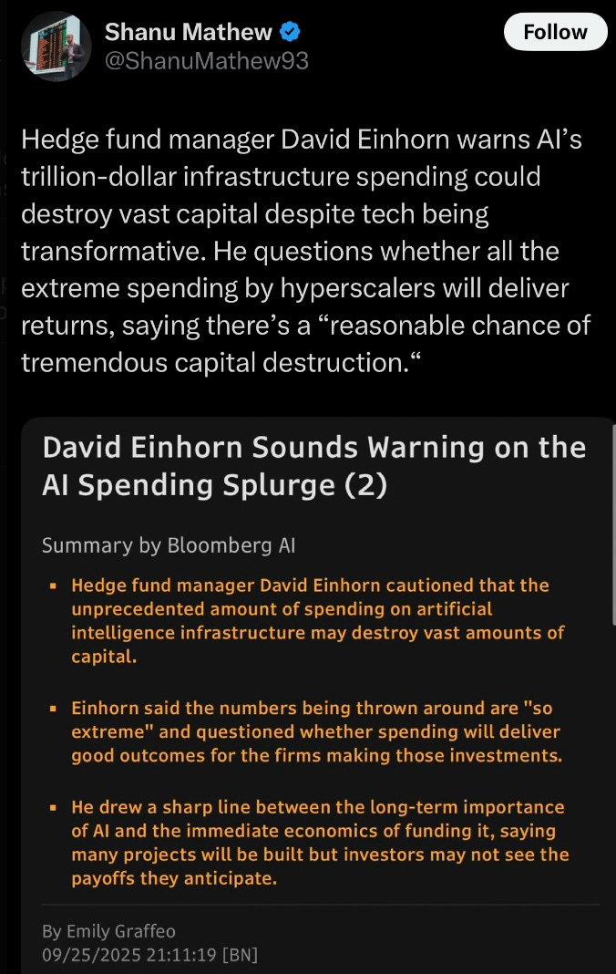 As I mentioned, Einhorn could have said the AI boom risked “losses,” or that hyperscalers might “overbuild.”