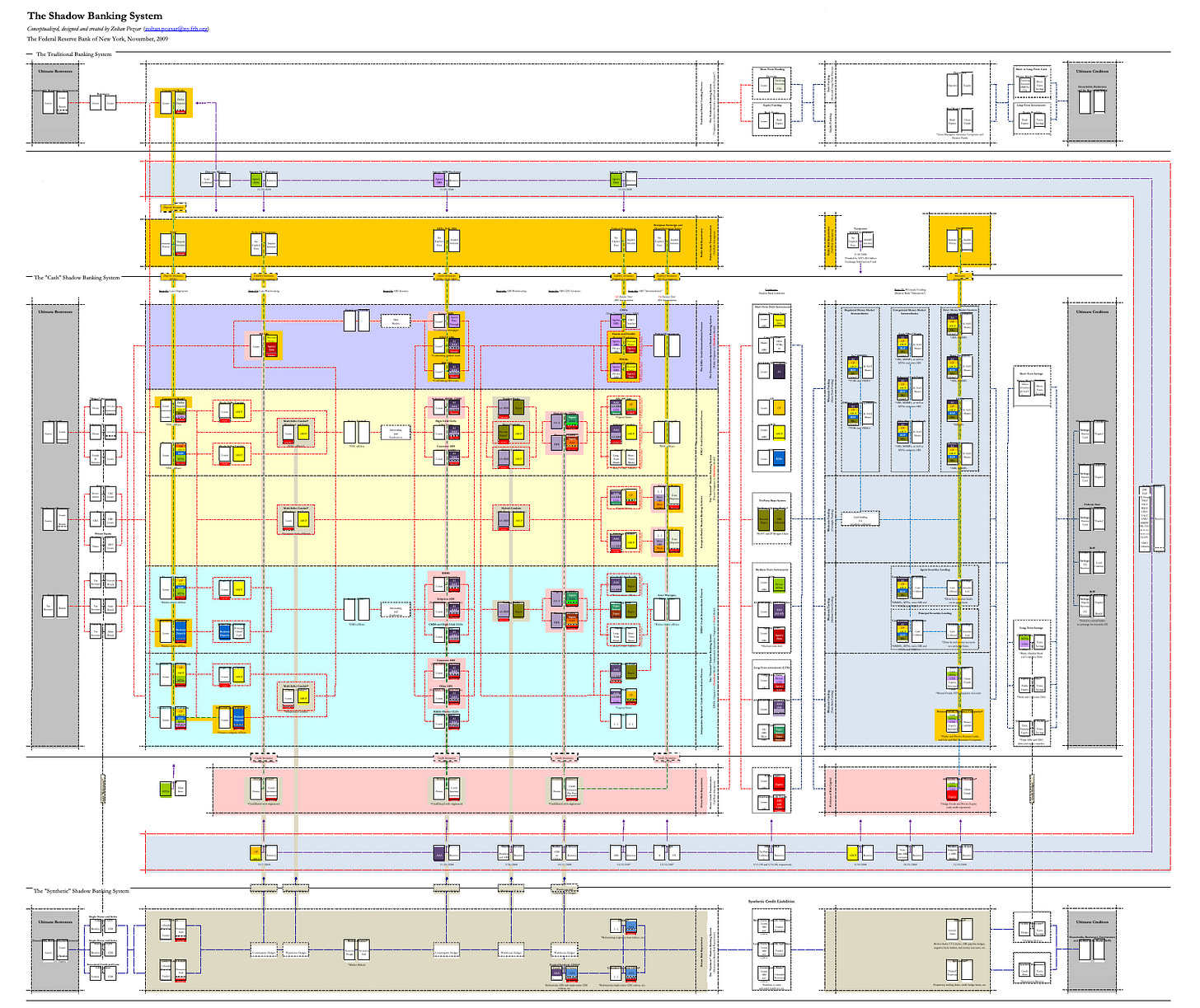 Poszar is controversial: part monetary genius, part macro heretic. But I’ve always loved his work, especially on new currencies and what he calls “monetary realism.” His most famous paper, Shadow Banking (New York Fed, 2010), was a Rosetta Stone for the financial crisis: it mapped the hidden plumbing of global credit creation, the vast web of repo markets and money funds that had quietly replaced traditional banks as the real engine of liquidity.