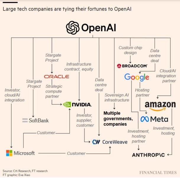 I love the connectivity diagrams you show, and I suspect estimations of the relative magnitudes would add the last piece of the puzzle -- exactly how unstable is the AI ecosystem today? What magnitude of correction would force the bubble to pop? (And how much could federal bailout funding do, at what cost, to postpone/exacerbate a hypothetical moment of truth?)