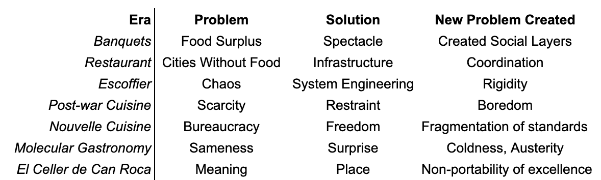 I.e.: Once ingredients were good, techniques were being shared and learned globally, and novelty was achievable, the next problem to be solved became existential:
